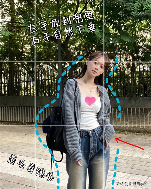 对于初学者来说,正对镜头站着是一个常见的选择。此时,你可以尝试轻微扭动胯部,为照片增添一些动感。右肩膀挎个包,不仅增加了整体造型的层次感,还能让手部动作更自然。两手自然下垂,保持放松状态,让摄影师从侧面捕捉你的侧脸和轮廓。