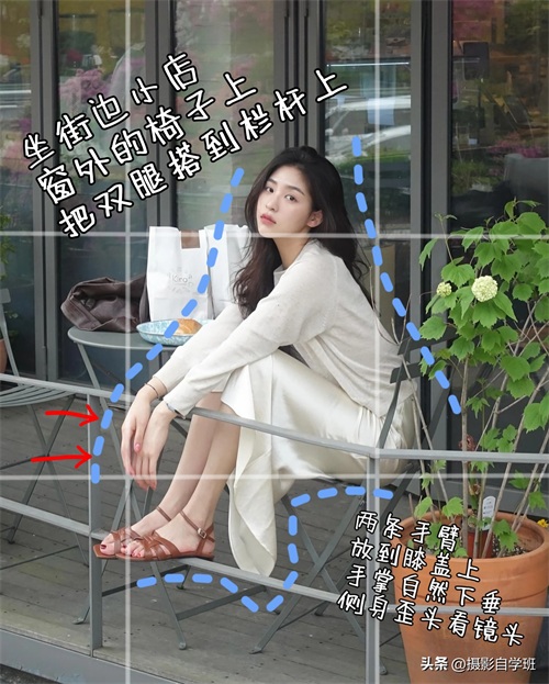 坐在街边小店窗外的椅子上,翘着二郎腿,侧身对镜头。这样的坐姿既舒适又惬意,非常适合拍摄休闲风格的照片。回头往后看时,记得要自然放松,不要过于僵硬。摄影师可以从下往侧拍的角度捕捉你的侧脸和腿部线条。