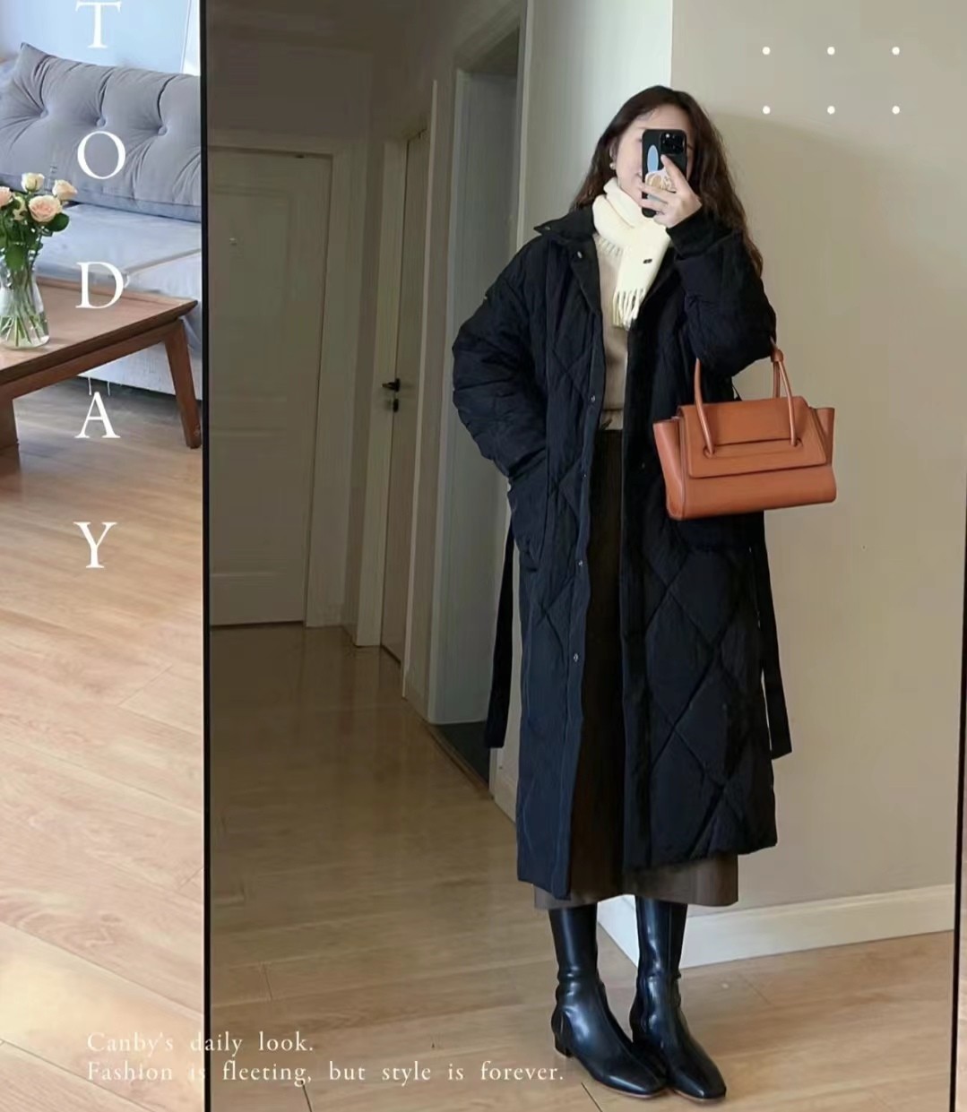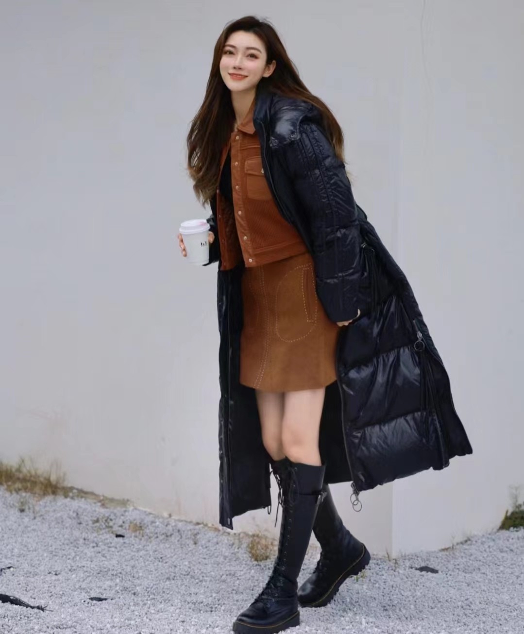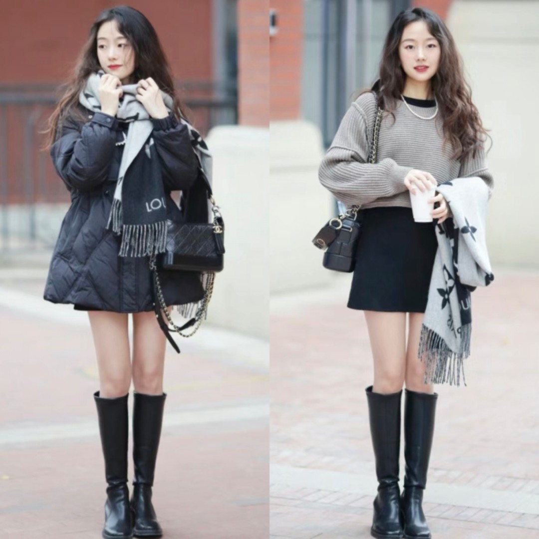 短裙和长筒靴的搭配是冬季常见的经典组合,配上黑色羽绒服,就能打造出女人味迷人的风格。短裙的长度可以选择膝盖以上的款式,而长筒靴则能修饰腿型,显得腿部更加修长纤细,两者结合,帅气又不失女人味。