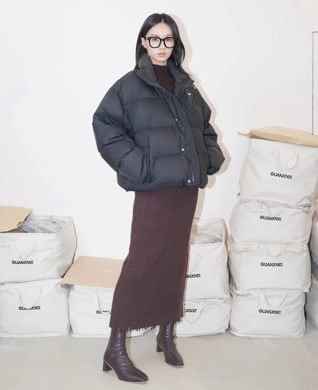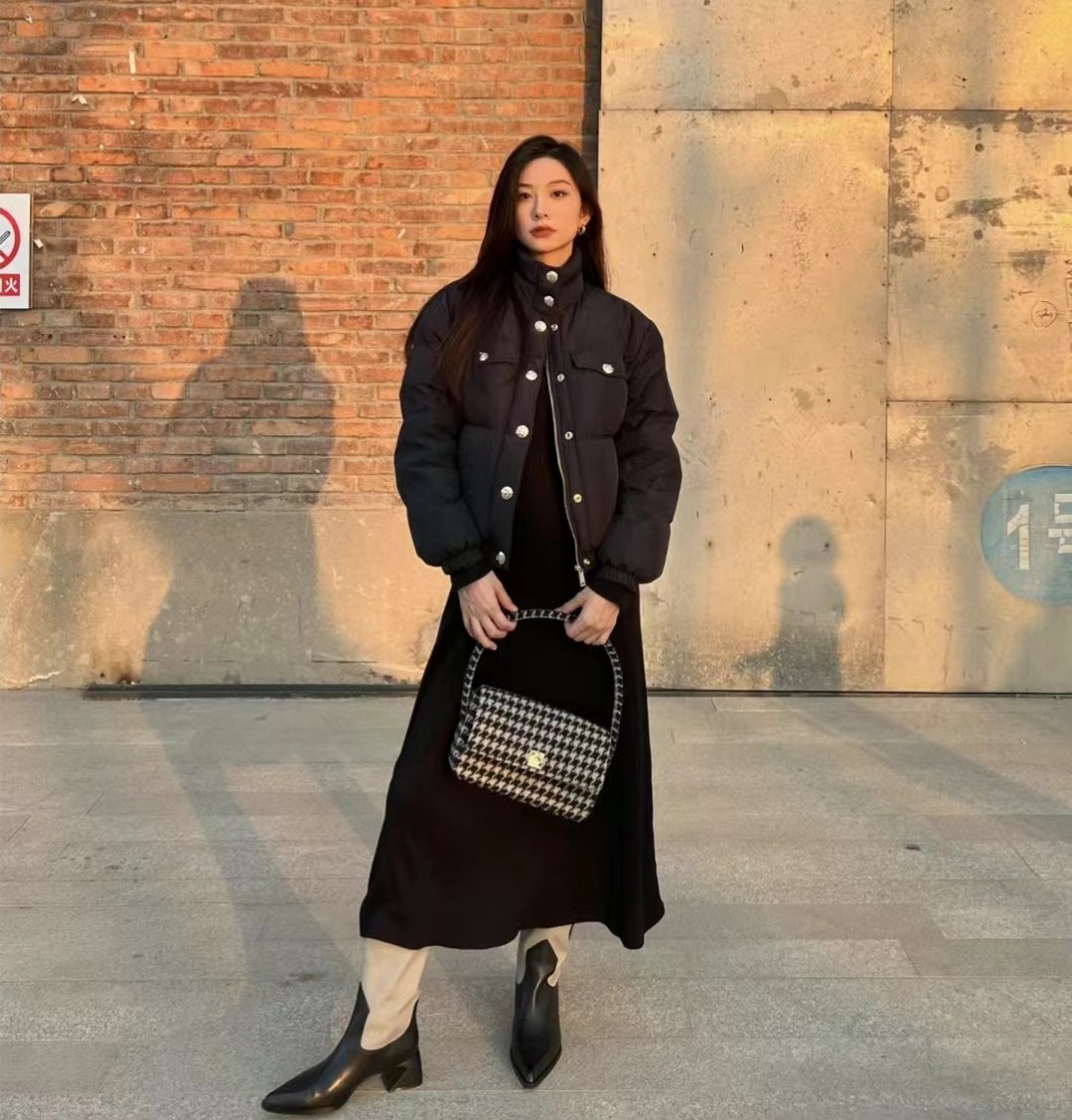 第七种搭配方法:黑色羽绒服+针织裙/短靴