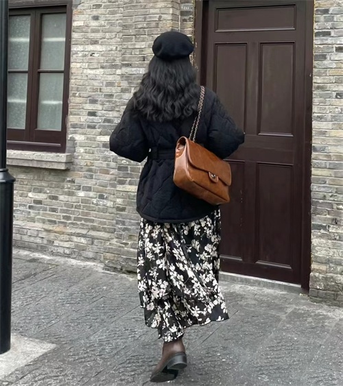 印花裙是女性的浪漫代表,与黑色羽绒服搭配碰撞出时髦的火花。选择色彩艳丽的印花裙,再配上一双黑色/棕色短靴,浪漫又不失时尚感,展现出复古优雅的女性魅力。