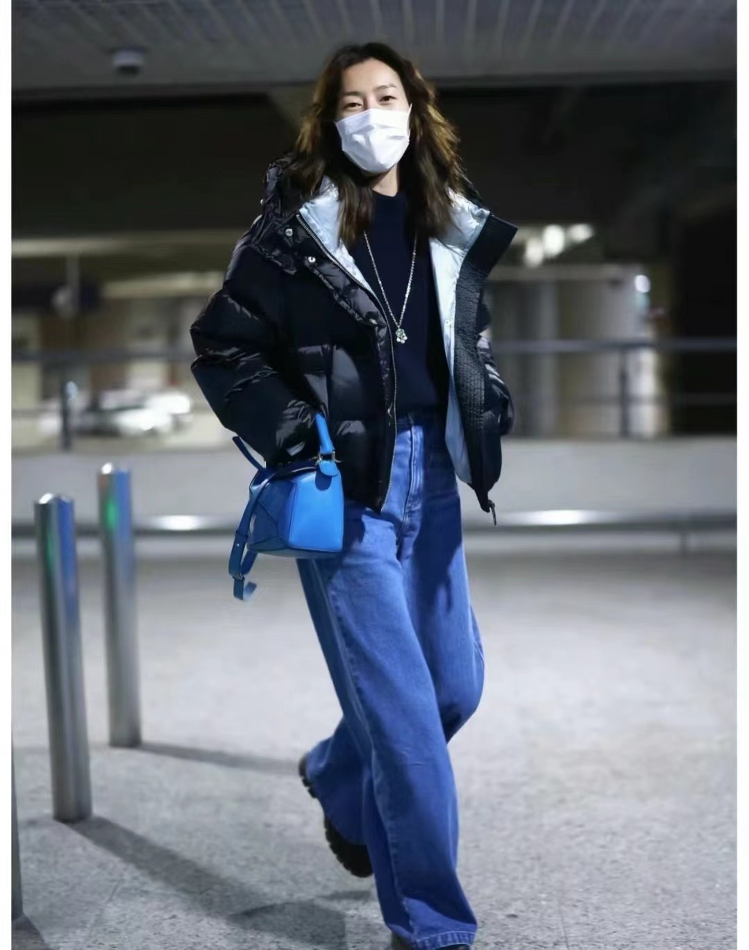 第一种搭配方法:黑色羽绒服+蓝色牛仔裤