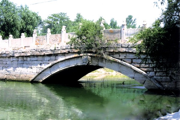 永济桥原名浪溪桥,坐落在东阿镇老城内浪溪河上,距今400多年历史。东阿镇为老东阿县治,浪溪中流,城分东西。中间1座大石桥横跨溪上,以济车马行人。桥型雄伟,南北望去横卧如虹。据《泰安府志》载:浪溪桥明弘治十三年(1500年)修建。当时垒石为三孔,因水冲毁。嘉靖三十三年(1554年)改建一孔木桥,高四丈,更名“永济桥”。隆庆三年(1569年)重修,稍减其高。现存桥为明万历年间(1614 年)所建。桥为单孔拱形,长55米,宽6.25米,全部用青石砌成。桥面两侧护栏,以栏板和石柱扣结而成。栏板上雕刻着精美的云朵图案。石栏与石栏之间石柱上雕有坐狮、石猴、蘑菇。雕刻精细,形象逼真,栩栩如生,神态各异。当地人把石桥石刻编成小唱:“十八个狮子一对猴,二八一十六个蘑菇头。独石一百零八块,南北三十个流水沟”。1995年,永济桥被公布为济南市第二批重点文物保护单位。