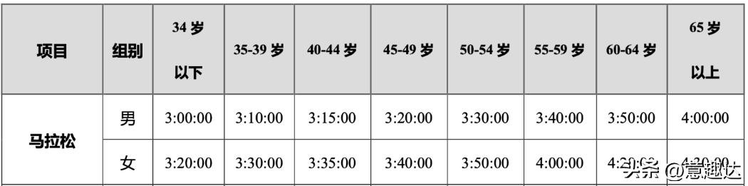 报名要求:参加2020年及之后中国田径协会认证赛事,完赛成绩达到现行《中国田径协会路跑赛事大众选手等级评定实施办法》大众选手等级评定成绩标准精英级成绩的跑者,如报名参赛,免抽签直接获得参赛资格。标准如下: