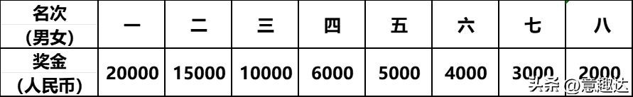 按枪声成绩录取男子、女子第1至第8名运动员,奖金见下表(单位:人民币)。