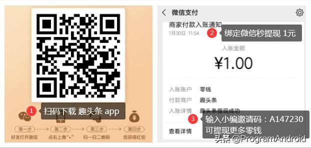 提现步骤:1.扫码下载 趣头条 app(新闻类app)。2.使用微信登陆,然后提现1元。3.填写小编邀请码 A1472304.小编提现1元 截图如下: