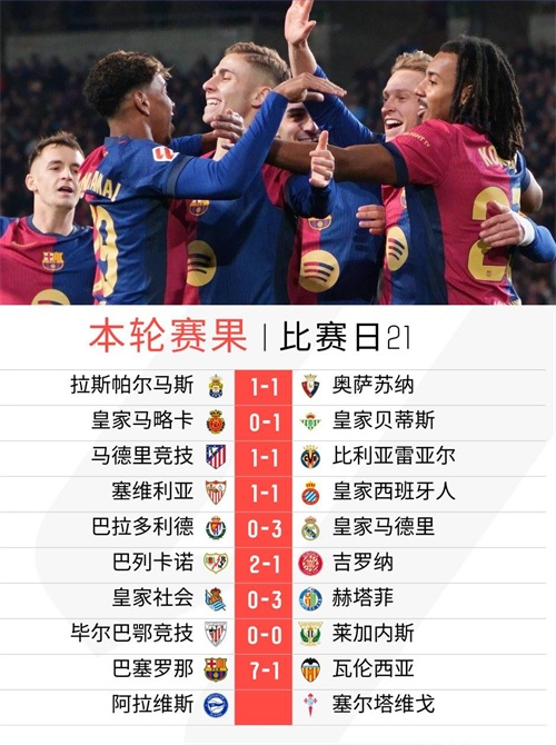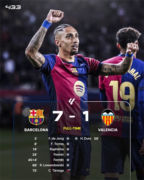 巴萨在主场用一场大胜强势宣布自己的回归。他们本场大开杀戒,7-1大胜深陷保级区的瓦伦西亚,上半场打进5球锁定胜局,德容、费兰、拉菲尼亚破门,费尔明2射1传。下半场再补两刀,而瓦伦西亚这边进球的是杜罗。最终巴萨7-1血洗瓦伦西亚,创造了本轮的最大比分。