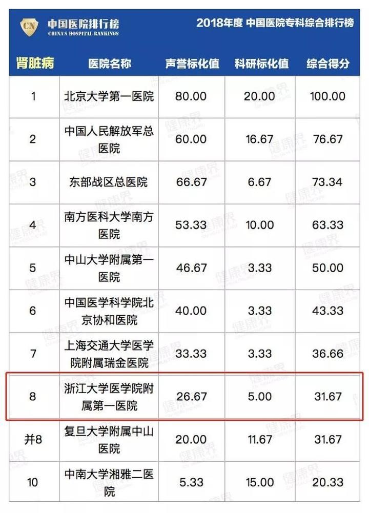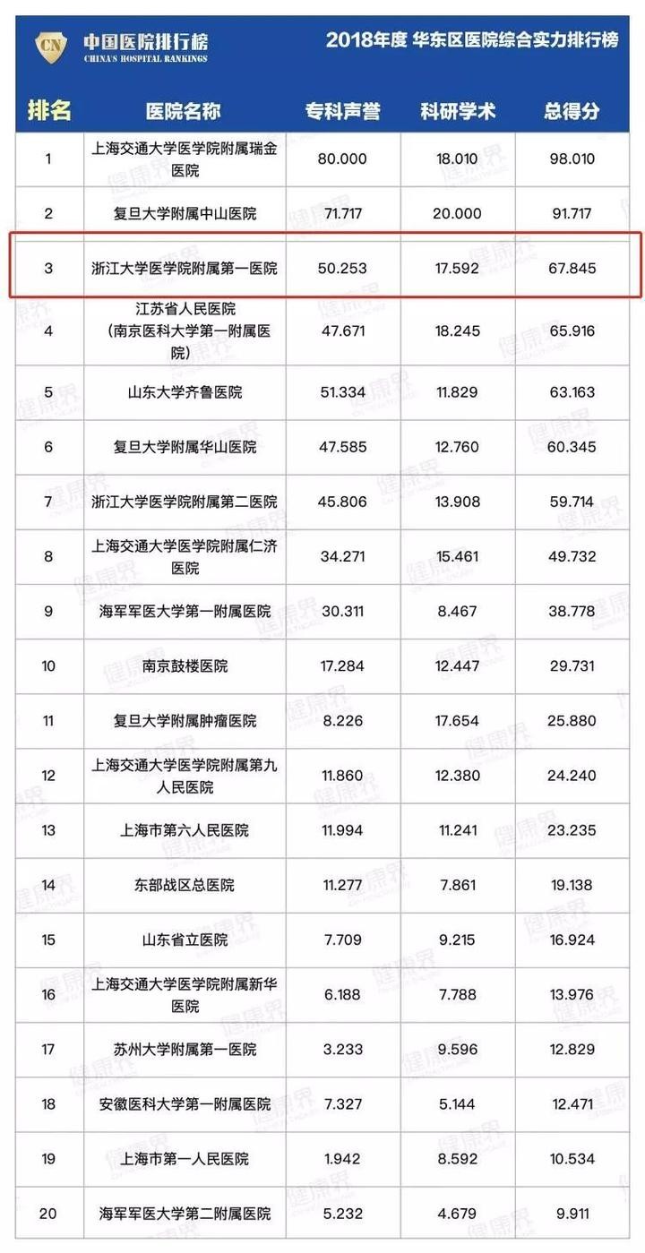 浙江大学医学院附属第一医院排名全国第14,比上年前进1位,华东地区综合实力排名第3,连续10年保持浙江第一。