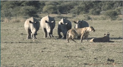 白犀牛只害怕鬣狗和狮子,它们用尿液和粪便标记自己的领地。白天,它们就在领地内安详的吃草,但是如果敌人走的太近,它们就会发怒,用蹄子刨地面,扬起尘土,以恫吓闯入者。