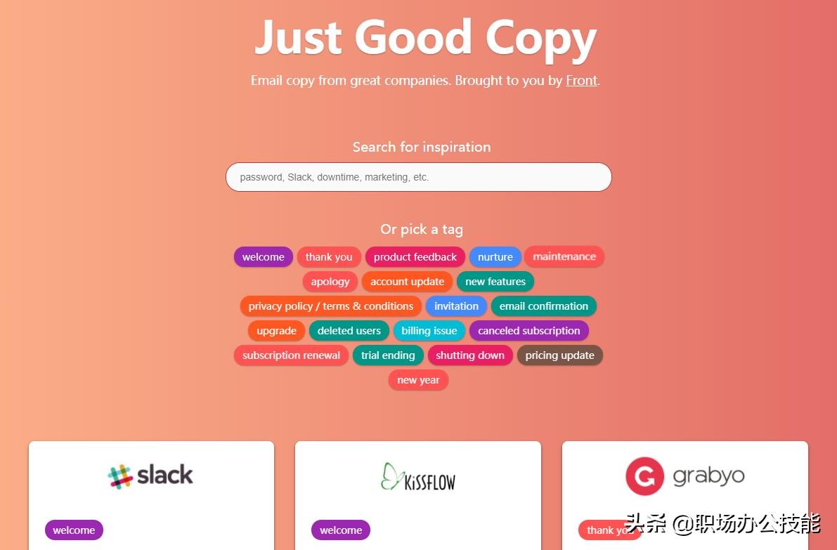 在工作中经常要使用英文邮件的朋友看过了,这个网站收录了很多大公司的邮件撰写范本,有欢迎邮件、道歉邮件、产品回访邮件,节日问候邮件等,可以使用标签筛选,也可以自己输入关键词,找到自己想要的英文邮件范例。