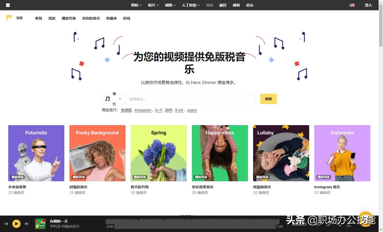 这是一个丰富的音乐资源素材库,虽然是国外网站,可以搭配翻译插件使用,歌曲按照音乐的主题风格流派进行划分,也可以输入关键词自行搜索,全部音乐都可以点击试听,无需注册就能免费下载。