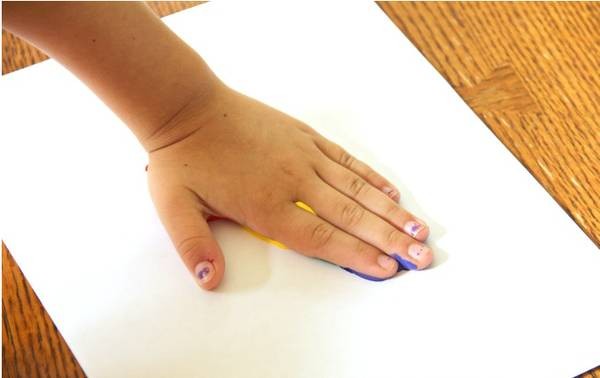 1、像下图所示,把不同颜料涂在孩子的掌心。