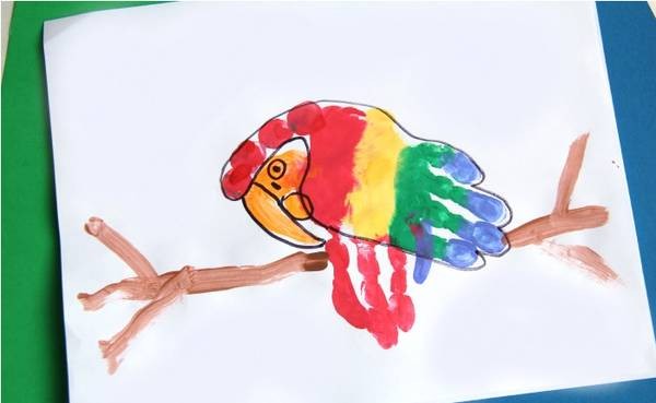 3、再用三个手指,涂上颜料,印成鹦鹉的翅膀