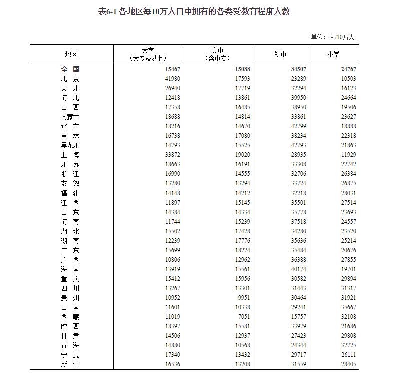 4、在受教育方面,每10万人口中拥有高中(含中专)教育的人数15956,初中教育人数30582,小学教育人数29894。