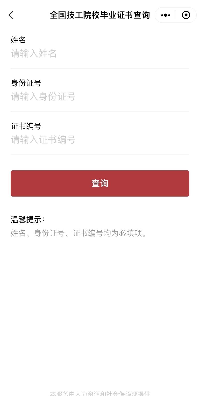 进入全国技工院校毕业证书查询服务,输入姓名、身份证号、证书编号,即可查询毕业证书信息。