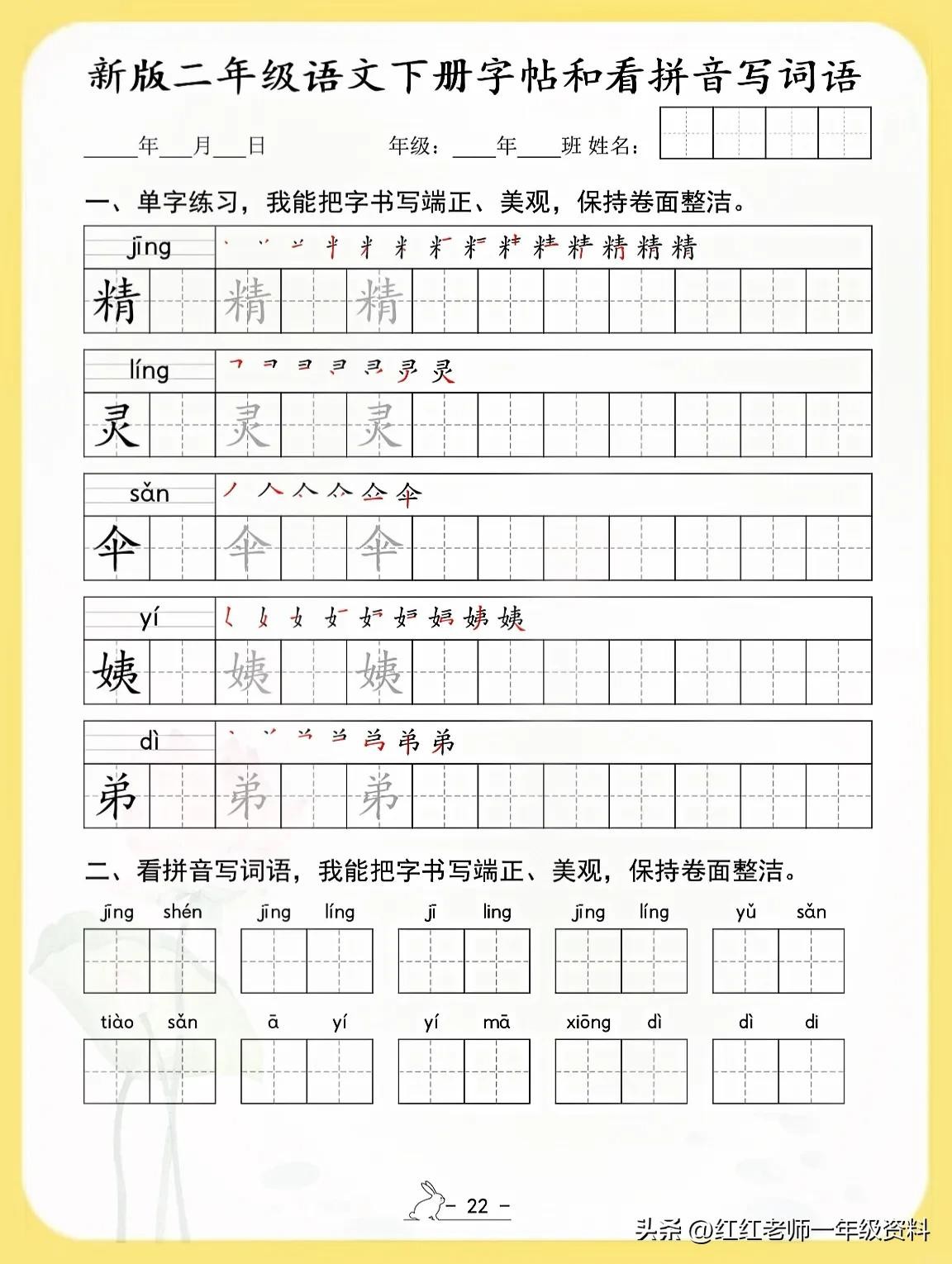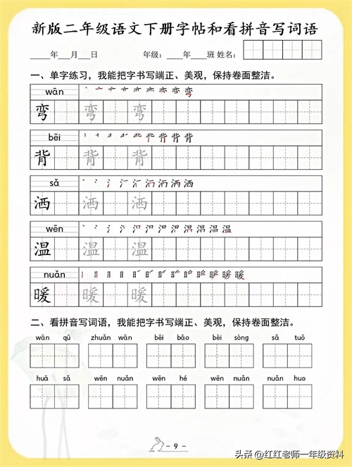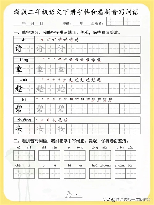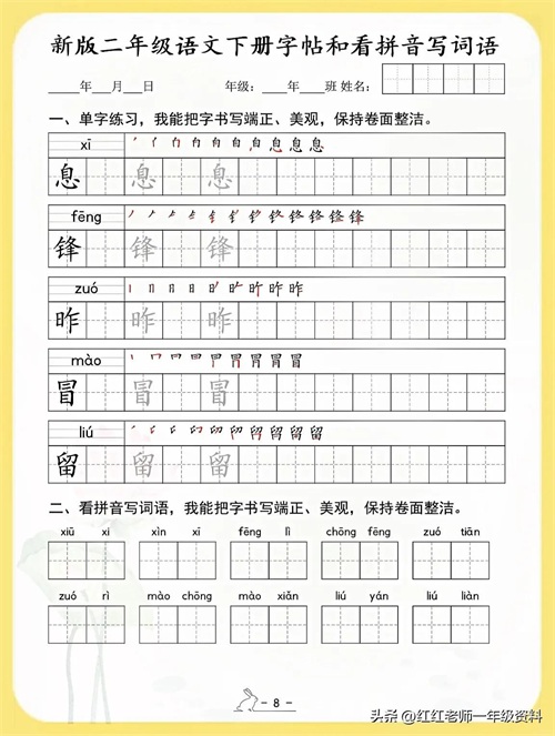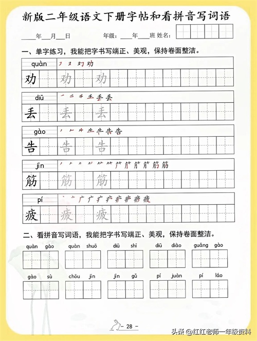 新版二年级语文下册字帖和看拼音写词语
