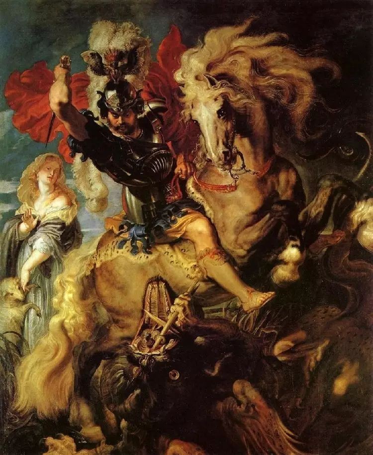 第二,恶龙形象不同。拉斐尔笔下的恶龙,它的长枪已折断,散落在地上,惊恐无措地等待着圣乔治的利刃砍下;而鲁本斯笔下的恶龙,虽然长枪被断,但它还是斗志昂然,竟然有一只人手拿着断枪,怒目相向凶恶异常,困兽犹斗。