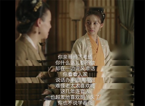 王大娘子听了如兰的话,训斥教育她“你亲哥哥下考场,你什么活儿也不干做,却在一边说风凉话,你看看人家,说话办事圆满周到,难怪老太太喜欢,这几年连官人也越发喜欢名药涂了,你也不说学着点”。