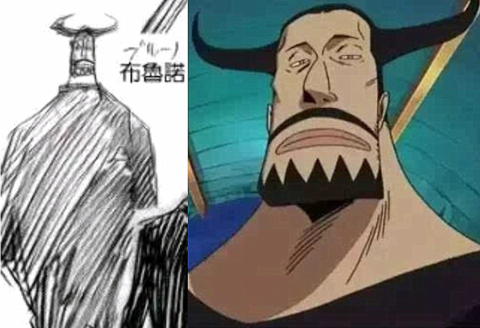 布鲁诺跟路奇是一样的,几乎没有太大的出入,依旧按照早期的草稿进行设计,最多就修改一些微笑的细节,反正他那一对角太亮眼了,不知道当时的尾田大神给布鲁诺安排的恶魔果实是不是动物系牛牛果实呢?
