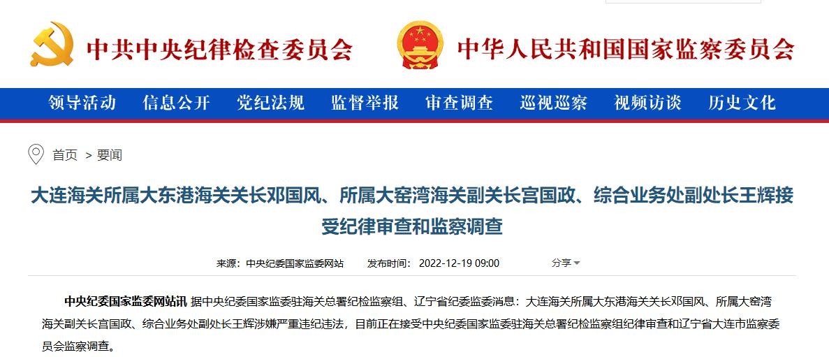 据中央纪委国家监委驻海关总署纪检监察组、辽宁省纪委监委消息:大连海关所属大东港海关关长邓国风、所属大窑湾海关副关长宫国政、综合业务处副处长王辉涉嫌严重违纪违法,目前正在接受中央纪委国家监委驻海关总署纪检监察组纪律审查和辽宁省大连市监察委员会监察调查。