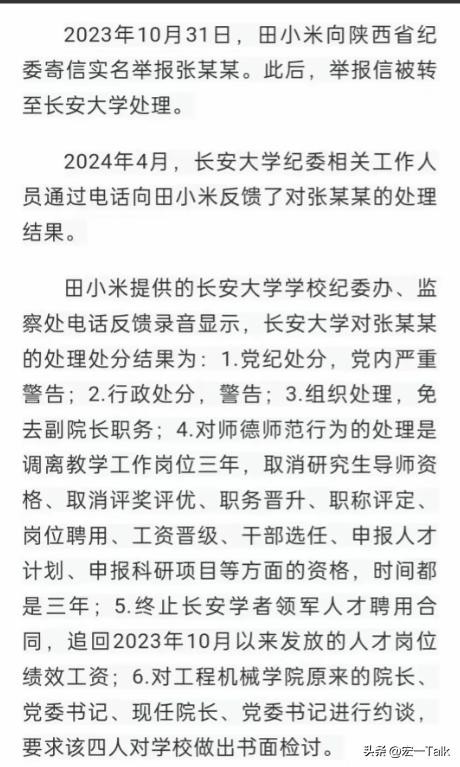 520当日,一女子(田女士)爆料出一则爆炸性新闻,田女士称长安大学机械学院副院长张某某隐瞒已婚有子的事实,通过婚恋网站骗取田女士的感情,并多次发生关系。