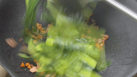 15. 加入挤干水分的黄瓜条,再加入蒜片翻炒