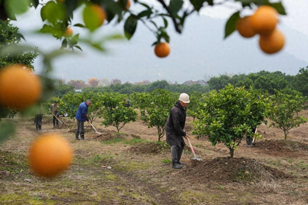永宁江畔的橘园里,来自黄岩区头陀镇孙家汇村的村民周春国正与10多名村民一起,拿着铁锹等工具为橘树施肥。