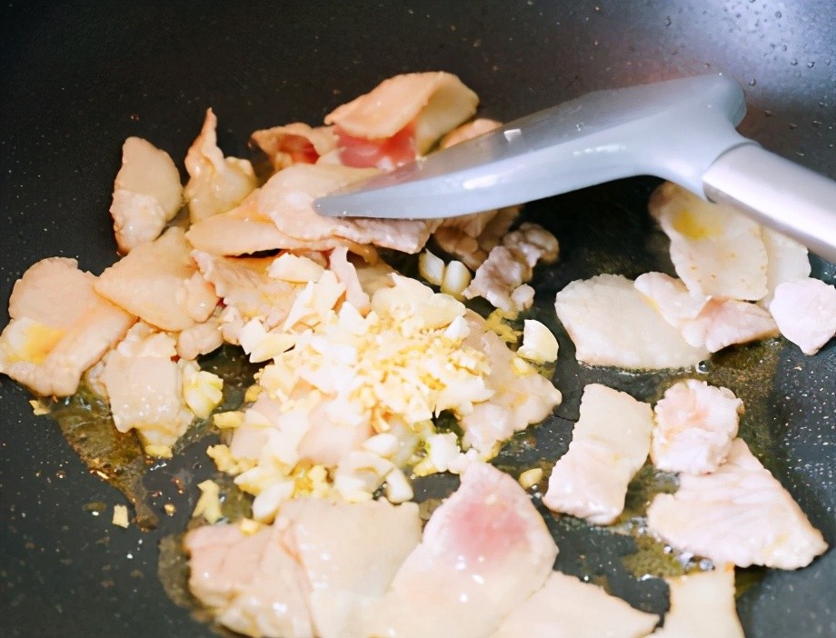 第三步,炒锅中添上少许的食用油,烧热后,放入葱花蒜末煸香,然后放入五花肉片,小火煸炒至变色,待将肉片的油脂炒出;