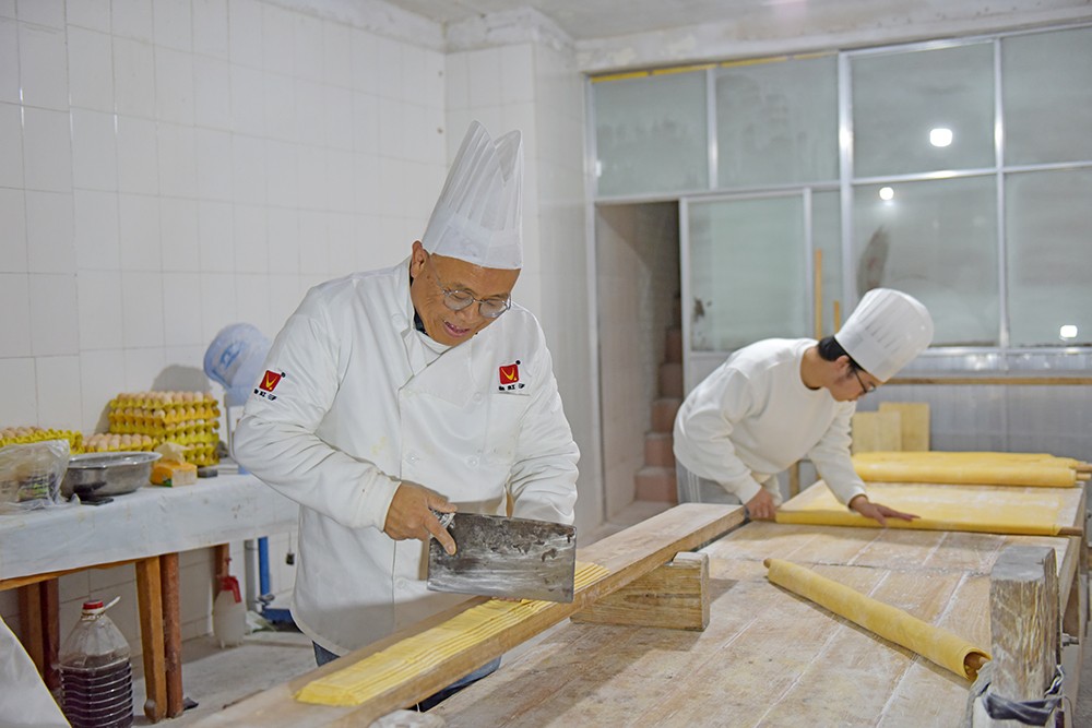 舒记杠子面的制作过程中,每一道工序都凝聚着匠人的心血和智慧。据第六代传承人舒基霖介绍,制作杠子面包含和面、压面和切面三个主要工艺,其中仅是压面就有九道工序,每一道工序里又有四道,总计达到三十六道。全部采用鸡蛋和面,在和面过程中基本不放水,全手工制作,从和面到切面,整个过程需要四五个小时才能完成。