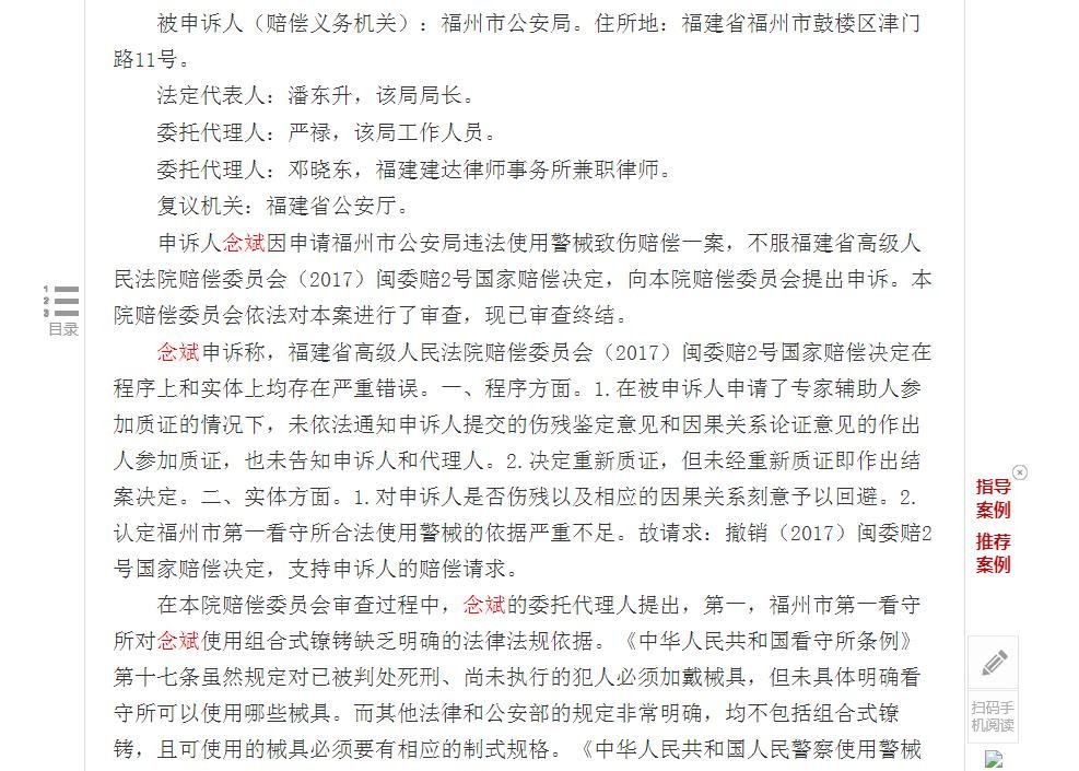 念斌再次向福建省高级人民法院赔偿委员会申请国家赔偿,理由是福州市第一看守所违法使用警械致其受伤。