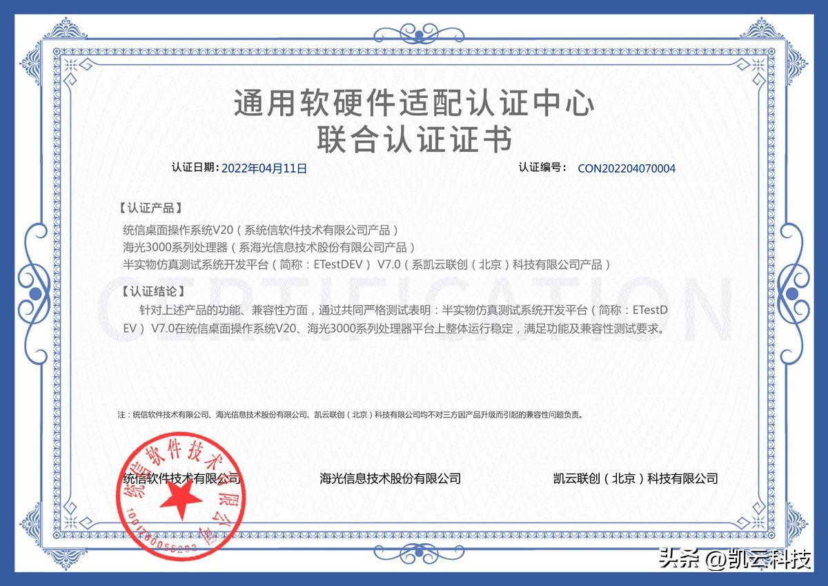 今年四月份,ETest通过统信软件联合认证,测试结果显示双方产品性能优异,完美兼容。即:半实物仿真测试系统开发平台ETest在统信桌面操作系统V20、海光3000系列处理器平台上整体运行稳定,满足功能及兼容性测试要求;半实物仿真测试系统开发平台ETest在统信桌面操作系统V20、兆芯ZX-C、ZX-C+、KX-5000、KX-6000系列处理器平台上整体运行稳定,满足功能及兼容性测试要求。
