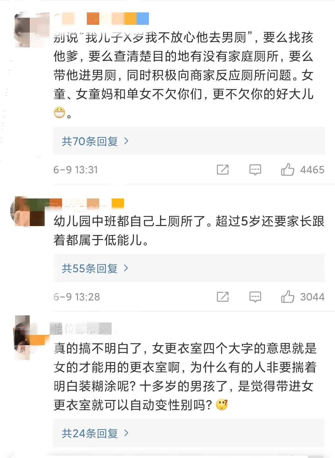 网友@knightofrose说:“从根本上解决问题要从商家入手,不能把压力都推给正当维权的女性。应该规定只要有人投诉且情况属实,商家没制止男童进入女厕所、浴室、更衣室的一律重罚,罚到商家肉痛为止。”