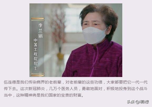 李兰娟中国工程院院士赞誉他,“伍连德是我们传染病界的老前辈,对老前辈的这些功绩,大家都要把它一代一代传下去。这次新冠肺炎,几万个医务人员,勇敢地面对,积极地投身到这个战斗当中,这种精神将是我们国家的宝贵的财富。”