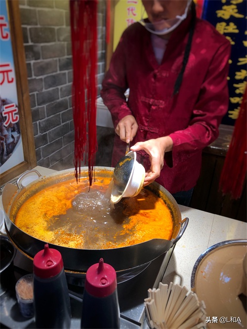 使用常见的汤爆/水爆手法,即汤水里三两次“进进出出”快速汆熟食材,随后转交给下一位淋上撒上麻酱、辣油、香菜等调料。