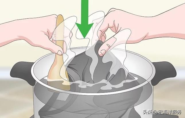 6、加入水并浸泡30-60分钟,不断搅拌。将衣服放入染浴中,用勺子或钳子将它们推到水下,确保它们完全浸透。为了帮助染料均匀地浸入织物中,至少每 5-10 分钟搅拌一次衣服。这有助于防止织物中的任何褶皱或束状物阻挡染料。