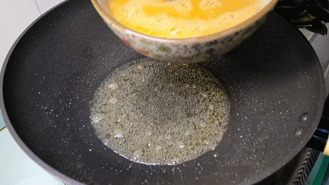 5.把锅内油温烧至六成热淋入鸡蛋液,鸡蛋刚下锅不要翻动,待鸡蛋定型后轻轻推散,炒成鸡蛋块。