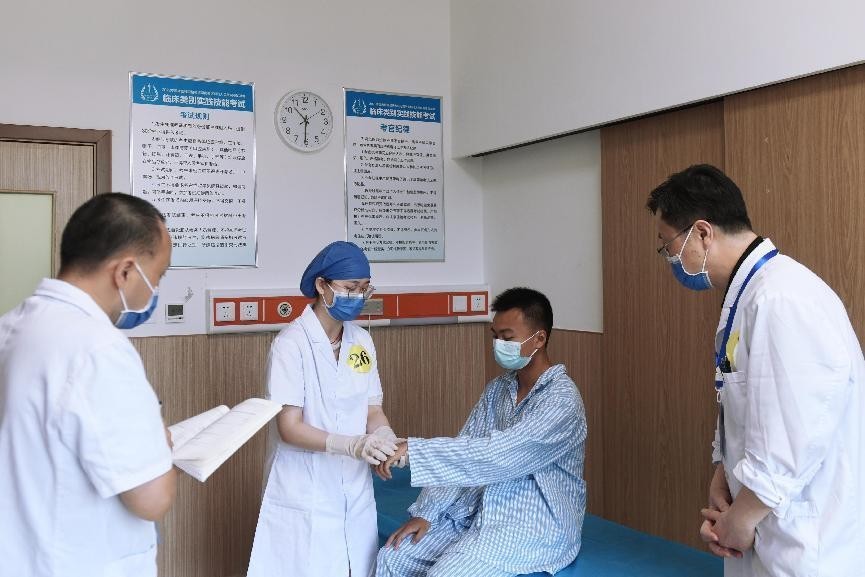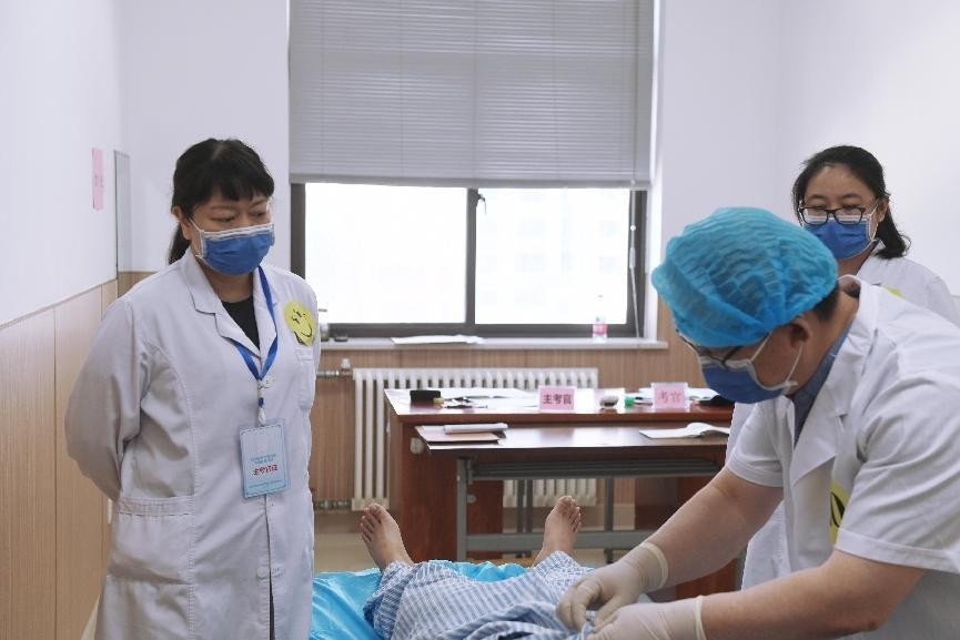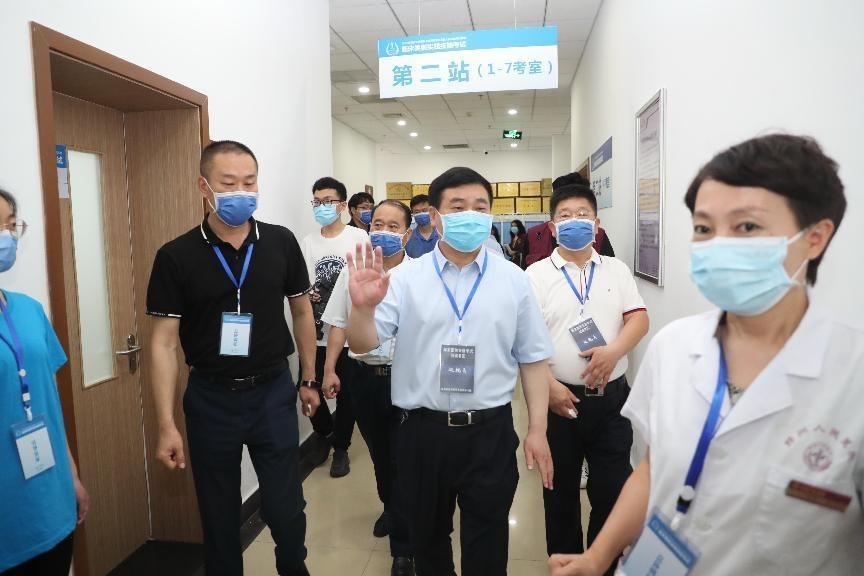 在巡察中,阚全程详细了解了郑州人民医院考试基地考试期间疫情防控和考务管理方面的具体做法、实施情况及落实效果,并深入考试基地实地查看了技能考试流程。