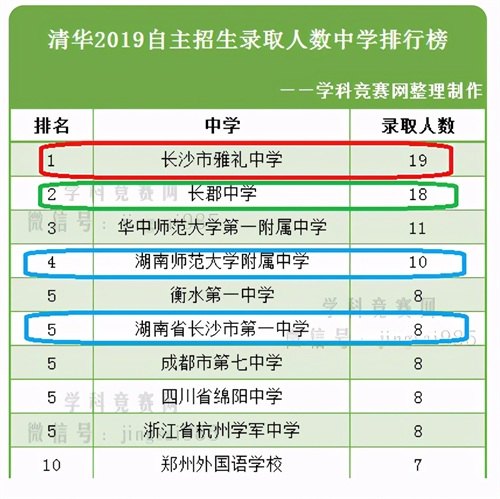 根据学科竞赛网整理的录取名单,2019年清华、北大自主招生中学排行榜中,长沙四大名校全部挺进全国前十名,在清华大学2019年自主招生中学排行榜中,长沙市雅礼中学排名全国第一,在北京大学2019年自主招生中学排行榜中,长沙市雅礼中学排名全国第二如图1,和图2所示。长沙的四大名校,既是湖南的四大名校也是全国的名校。