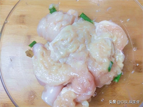 第2步,然后把捶好的鸡胸肉放进大碗中,加入葱花,生姜,料酒,抓拌均匀,放在一旁腌制一会儿。