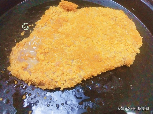 接着把鸡胸肉上面裹上面包糠,放进锅中煎制就可以了,煎制两面金黄,家常版的鸡排就是做好了。
