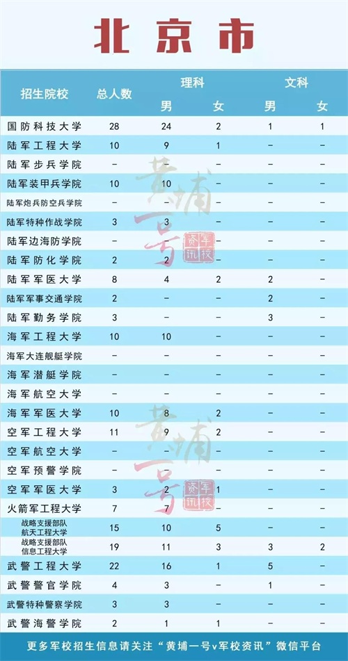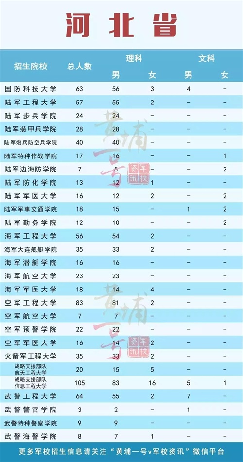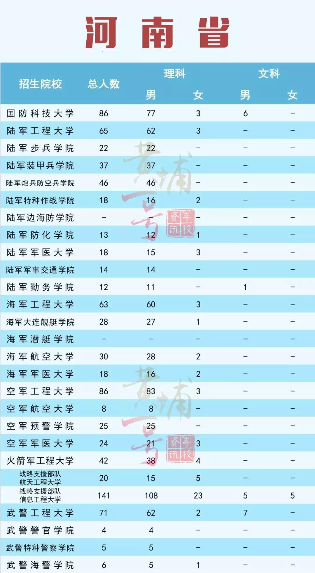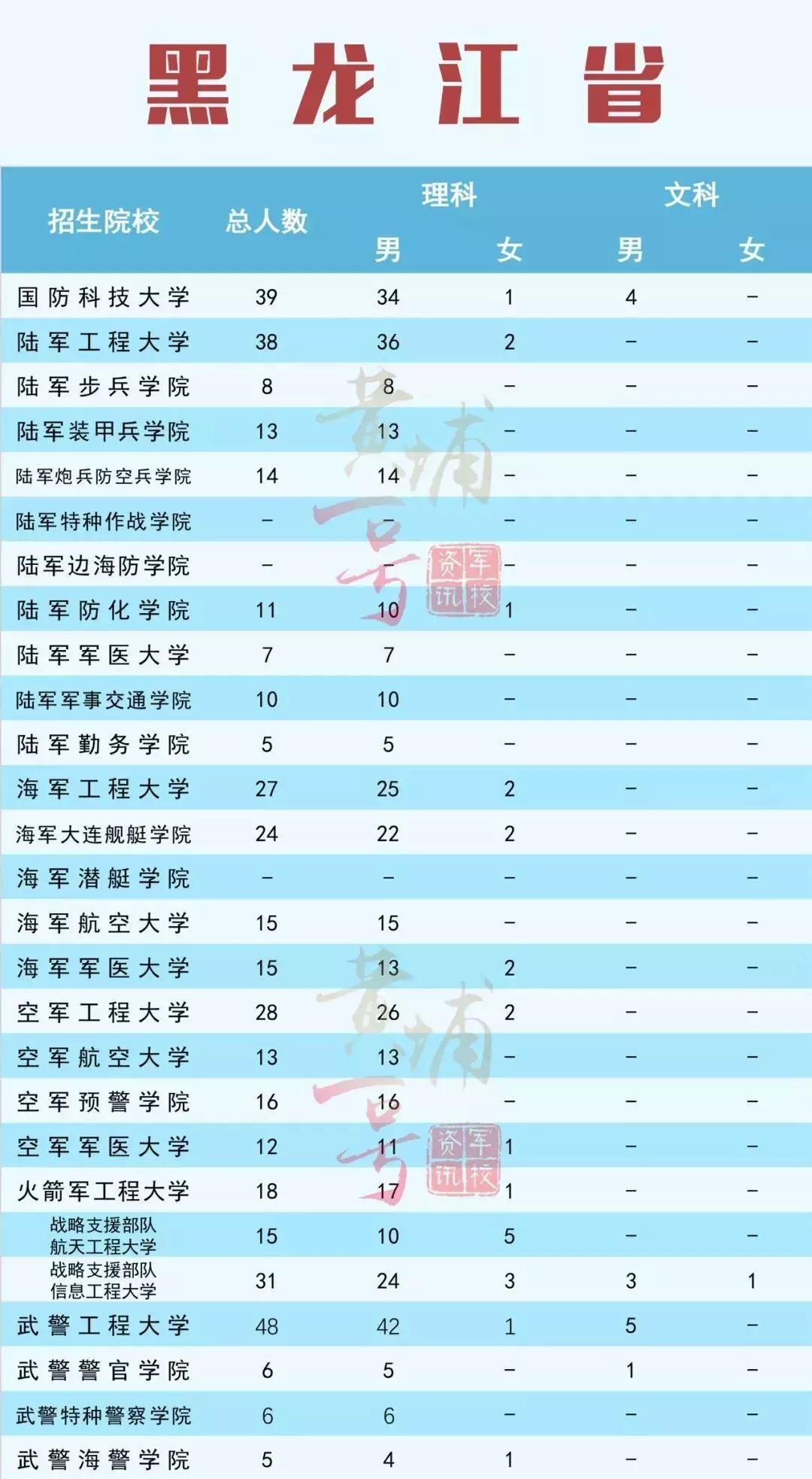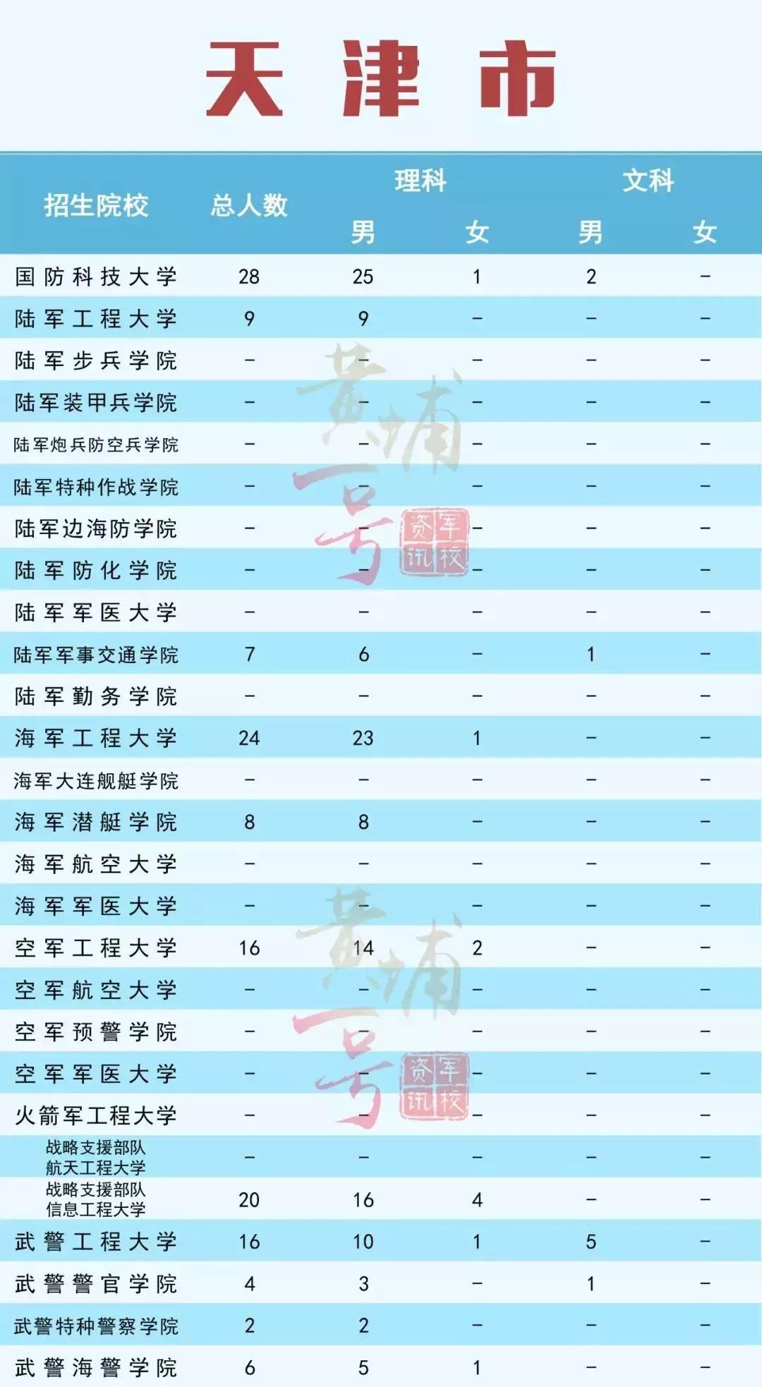 温馨提示:以上军队院校在各省市区的招生计划,为各校在当地招生总数,没有具体到各专业的招生人数。考生报考时,须注意各校发布的专业目录,以及各招生专业的体检要求。