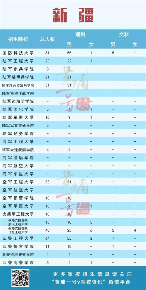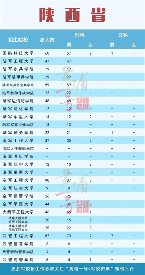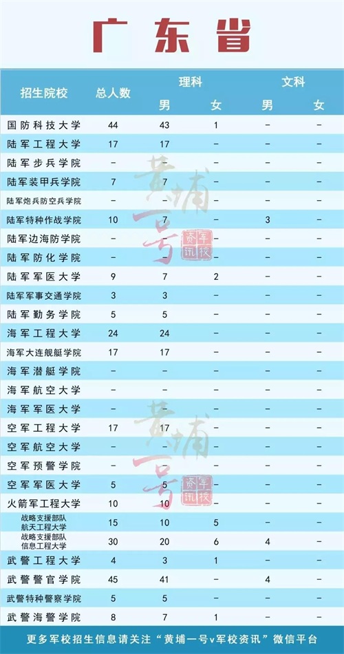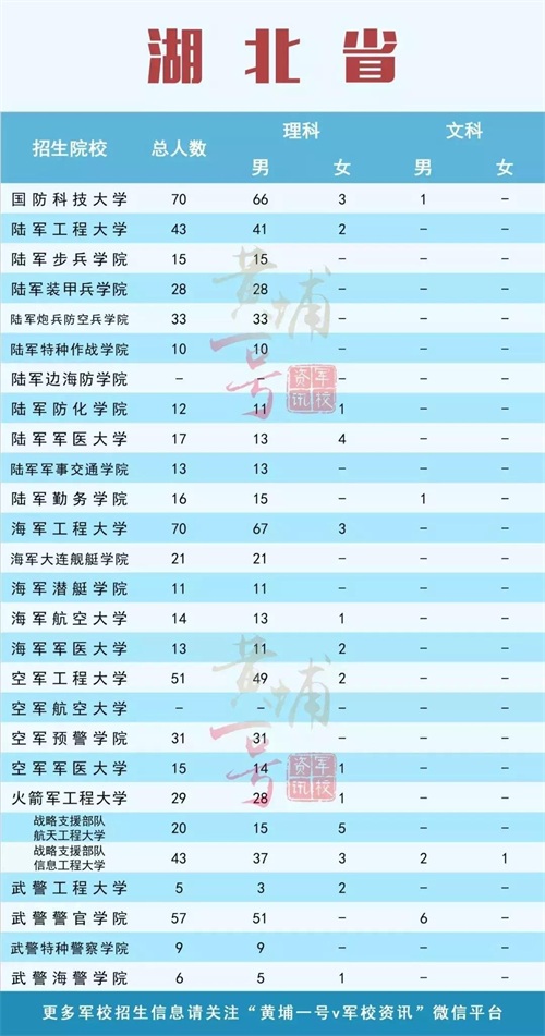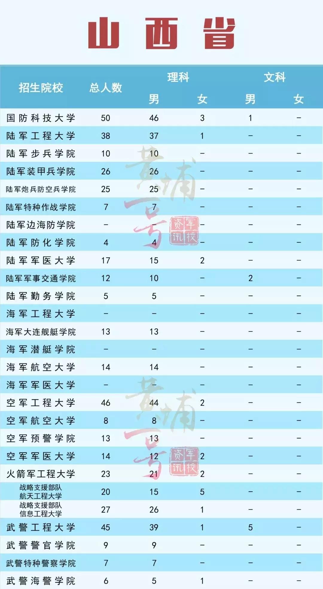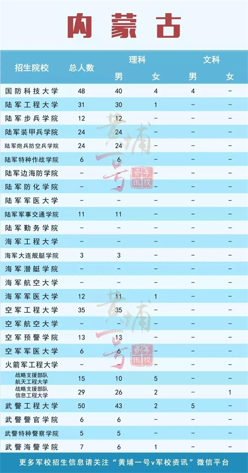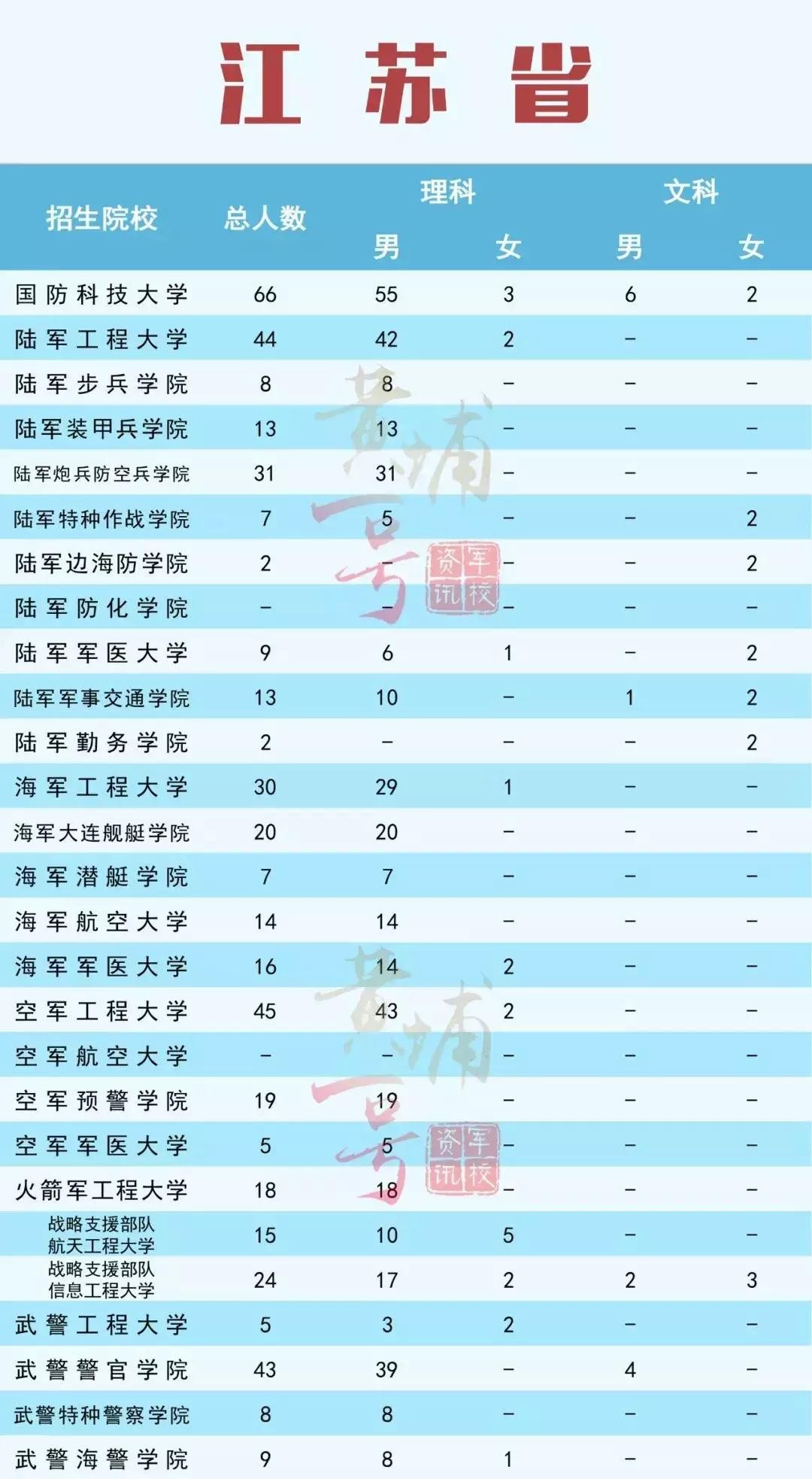 温馨提示:以上军队院校在各省市区的招生计划,为各校在当地招生总数,没有具体到各专业的招生人数。考生报考时,须注意各校发布的专业目录,以及各招生专业的体检要求。