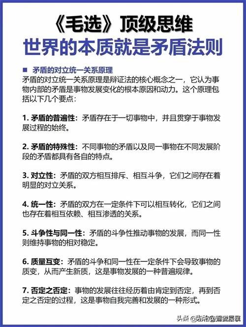 毛泽东凭借对矛盾法则的深刻洞察,领导中国革命披荆斩棘、改天换地;于今时今日,这一法则依旧熠熠生辉,照亮我们前行之路。它赋予我们穿透表象、直击本质的慧眼,面对生活琐碎、职场挑战、时代巨变,精准剖析矛盾、巧妙驾驭矛盾,以从容之姿书写精彩人生华章。此刻,就从细品身边矛盾现象、反思过往矛盾应对入手,将矛盾法则深植思维,向着驾驭人生、顺应时代全速启航。或许,下一次回首,你就能凭借这份智慧在矛盾漩涡中稳立潮头,收获他人赞叹目光,深知世界本质矛盾法则的磅礴伟力,坚定迈向辉煌未来之路。那么,就从现在开始吧!