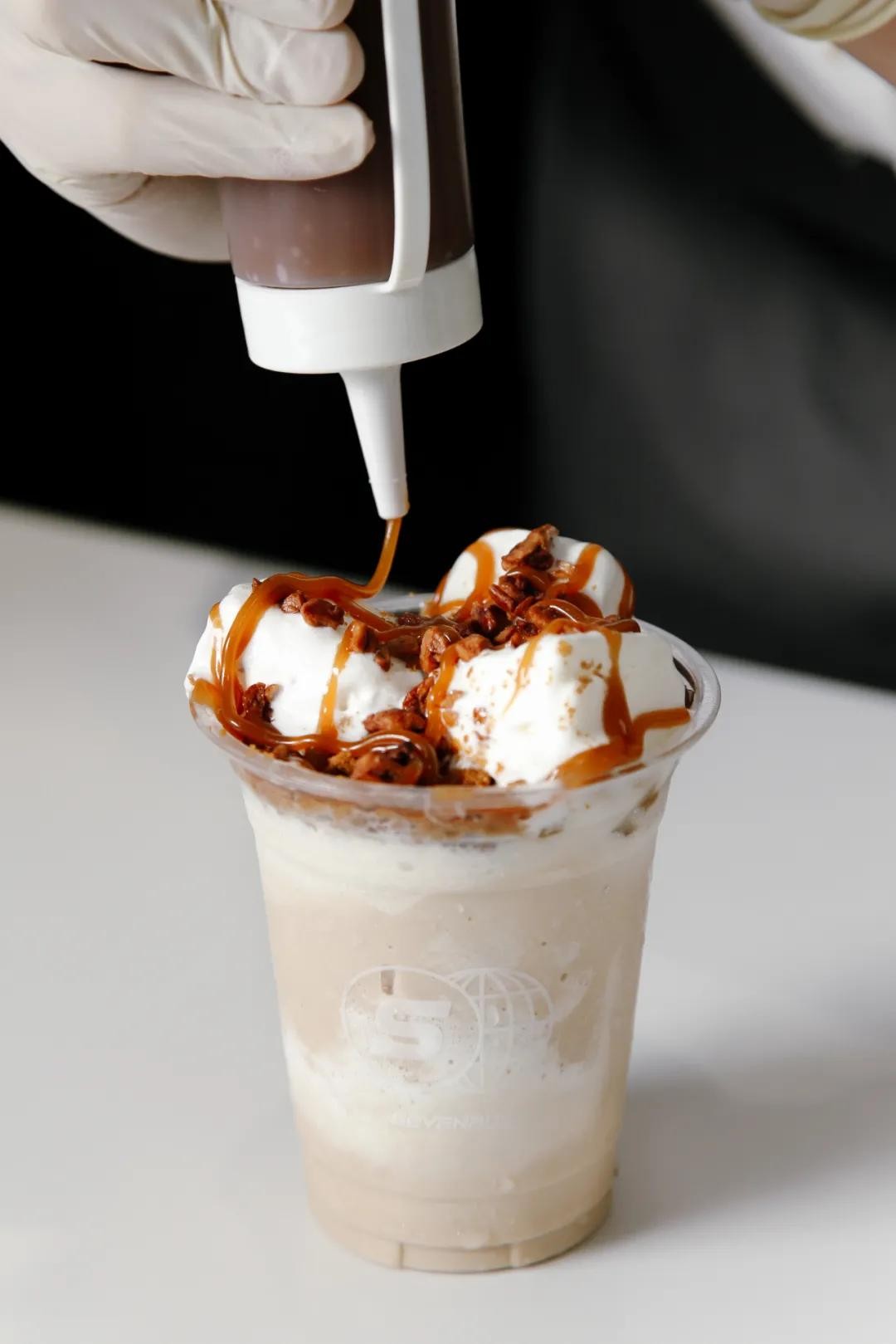 采用传统咖啡奶泡的制作工艺,打出绵密的鲜牛乳奶泡,挤上比利时特醇焦糖酱,有点拉花内味。