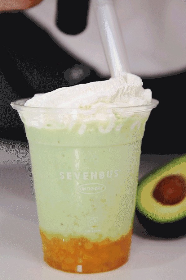 用进口墨西哥牛油果肉,加入整瓶养乐多和味全鲜奶制成奶昔,口感如同高品质冰淇淋,奶油顶再撒满薄脆片,很难逃离女生的魔爪。