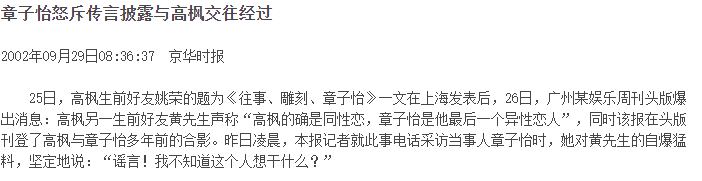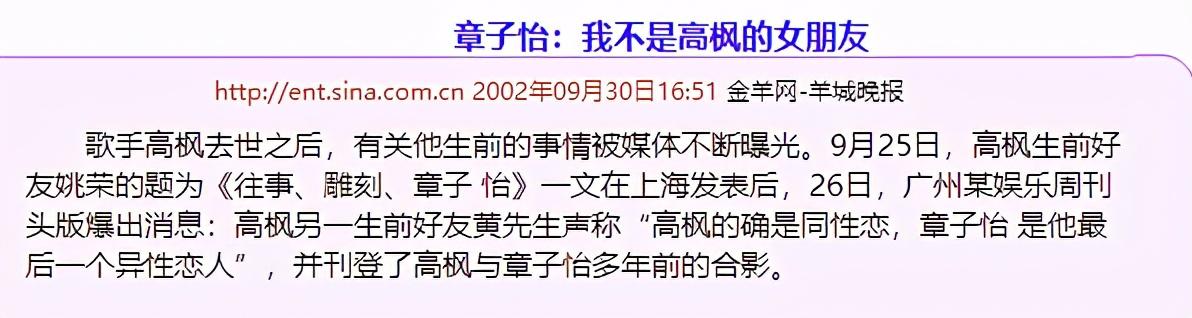 2002年,高枫去世,高枫是何许人也?这位就是《大中华》的原唱,高峰去世后,其生前好友姚荣以《往事、雕刻、章子怡》为名写文悼念,指出:章子怡是高枫最后一个异性女友。