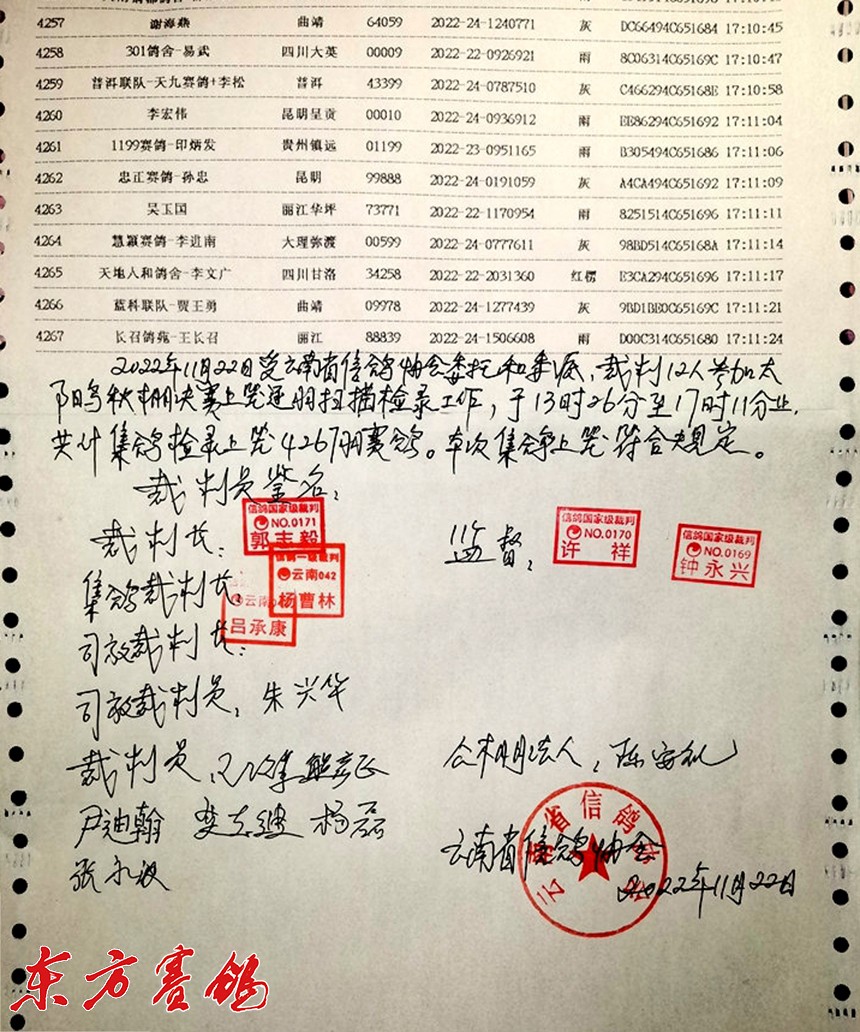 2022年11月22日下午1点,云南省信鸽协会许祥会长召集裁判员开会,明确执裁判员各自的职责,确保省监赛的太阳鸟公棚三公透明,本届执裁由云南省信鸽协会委派裁判执裁,共有裁判11人,其中国家级裁判3人、一级裁判3人、二级裁判5人。13点26分开始逐羽扫描、核对羽色、环号,加盖翅膀章、粘贴密码条、电脑同步录入上笼鸽信息,再装车上锁铅封。经过5个多小时裁判员们辛勤工作,共集鸽4267羽,上笼工作结束后,对鸽车上锁铅封,裁判员在集鸽单上签字确认;司放车由司放裁判长吕承康和司放裁判员朱兴华随车监赛。