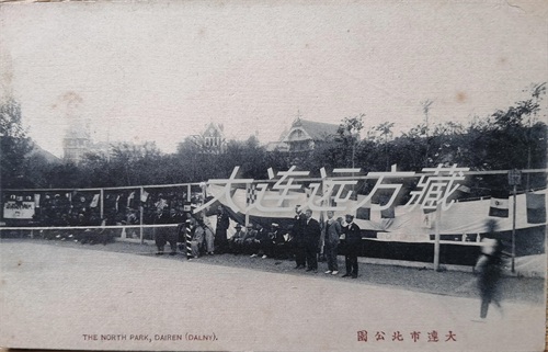 1909年大连开始铺设电车轨道,电车也通到了北公园门前,这是当时发行的“大连电气铁道线路图”老明信片。