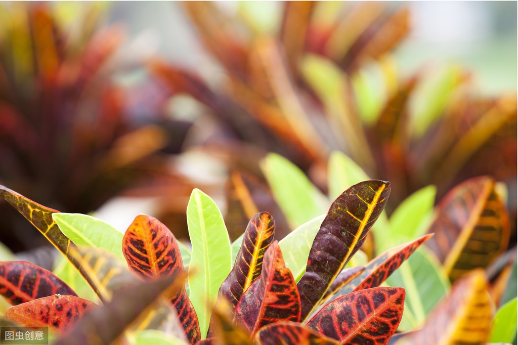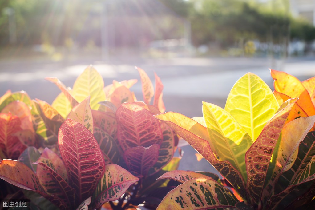 变叶木最吸引人的地方就是其叶片鲜艳的色彩及多变的颜色,如红,橙红,紫红,黄,绿等,它性喜充分日照,日照越充足,颜色越鲜艳。变叶木喜欢明亮的光线,并在其中茁壮成长,实际上需要光照来生产那些令人惊叹的五彩叶子哦~