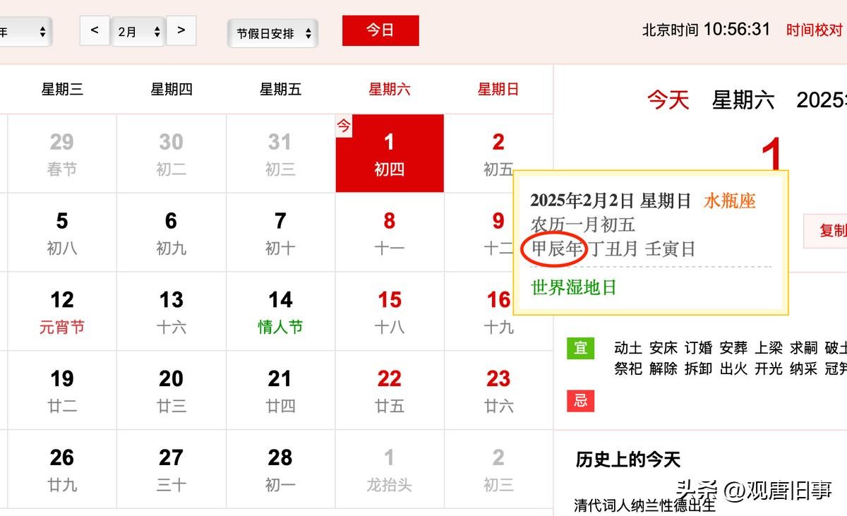 不信看看日历上,正月初五还是甲辰年,从立春、正月初六开始,才是乙巳年。严格来说,是从这一秒开始,斗指寅位,太阳黄经到达315度,“一岁”的时光就开始了,属相的切换也从这一刻开始。